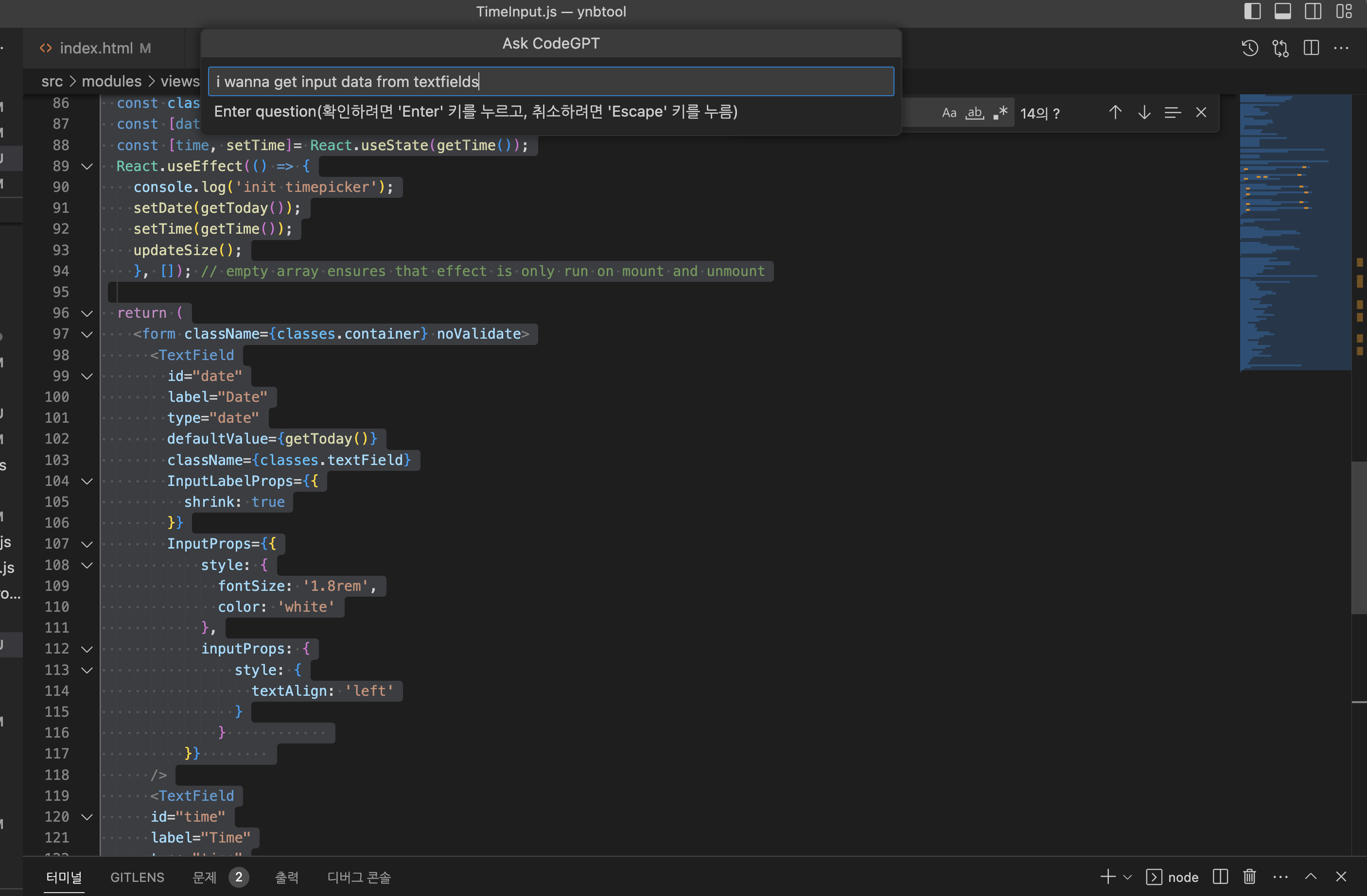 코드 gpt와 함께 개발하고 있는데, 아주 훌륭하다. 어떤식으로 활용하고 있냐면, 내가 작성한 코드에서 추가하고싶거나 바꾸고 싶은 것에 대해 gpt에게 물어보면 gpt가 이렇게 하면 어떻겠냐고 추천해준다. 아. 일단 비쥬얼스튜디오 코드에서 플러그인 형식으로 사용하는게 편한것 같다. 플러그인 형식으로 할 경우, 내 코드를 선택해서, 코드에 적합한 추천코드를 받아볼 수 있다.