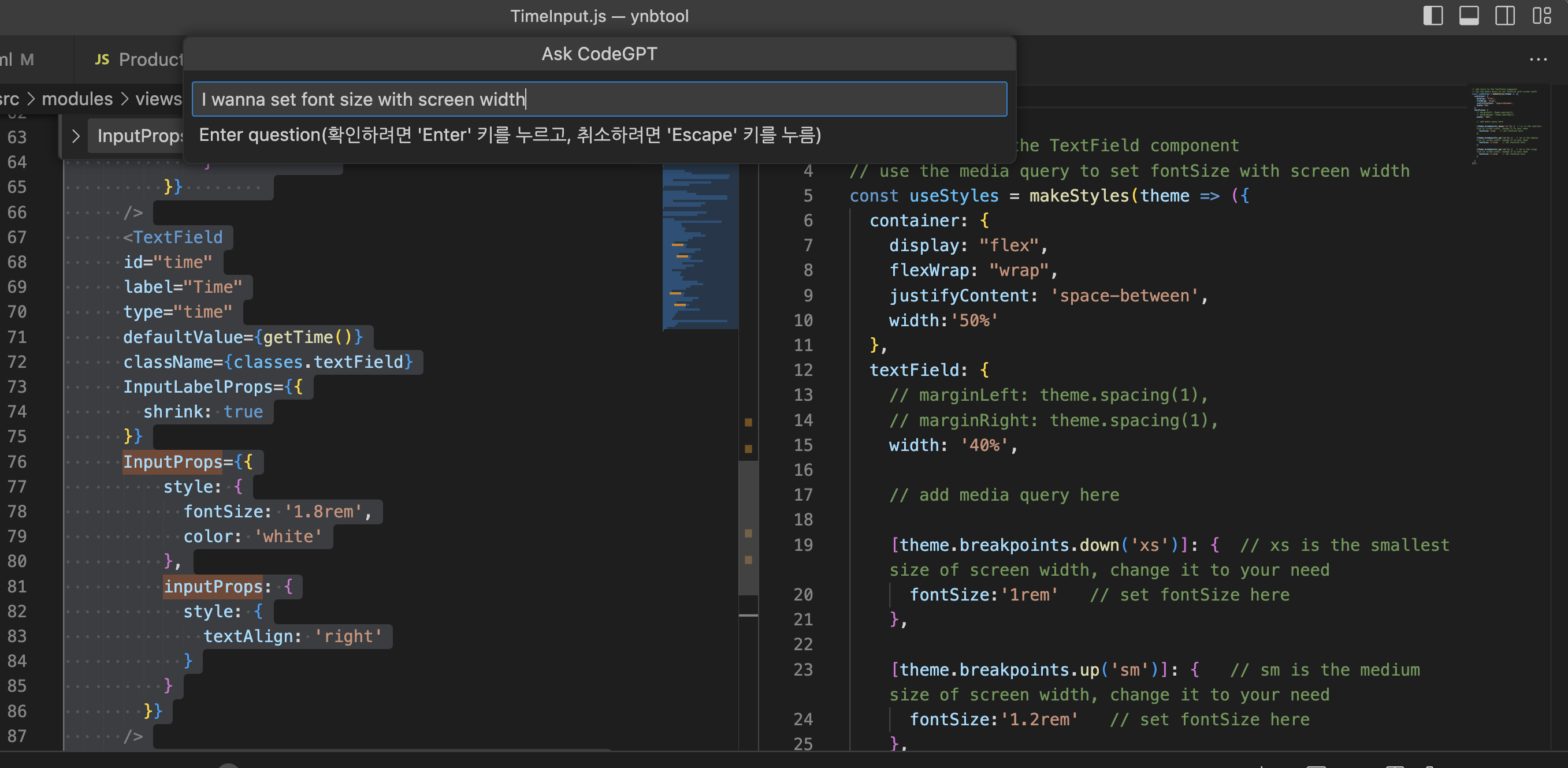 내가 물어본 것은 screen size마다 폰트 사이즈를 조정하고 싶다고 말했고, code gpt는 오른쪽처럼 코드를 추천해준다. 코드는 보면 size에 따라 fontSize를 설정해놓은 style을 제공하는 코드였다. 한번 넣어본다. 궁금한게 있을 때마다 검색하는것처럼 gpt에게 물어보면서 하면 된다.