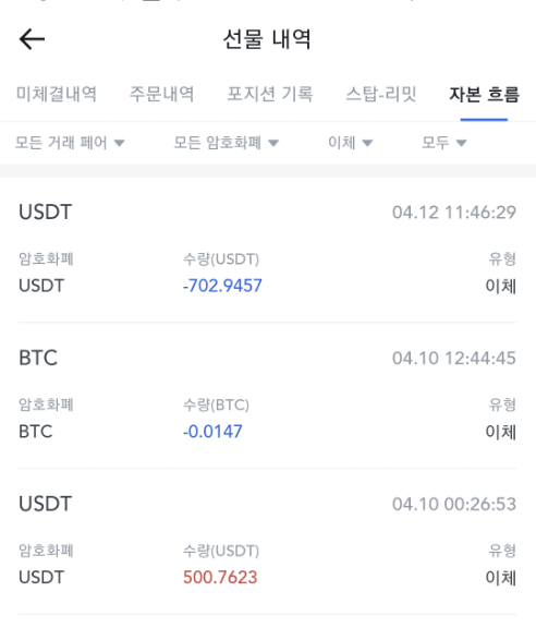 아래 사진은 제가 $500로 롱숏으로 걸어서 선물지원금으로 $700을 만든 것입니다. 보시면 4/10에 500을 입금했고, 이걸로 4/12에 $700을 만들었습니다. 선물지원금 받은만큼만 가능한 것입니다.