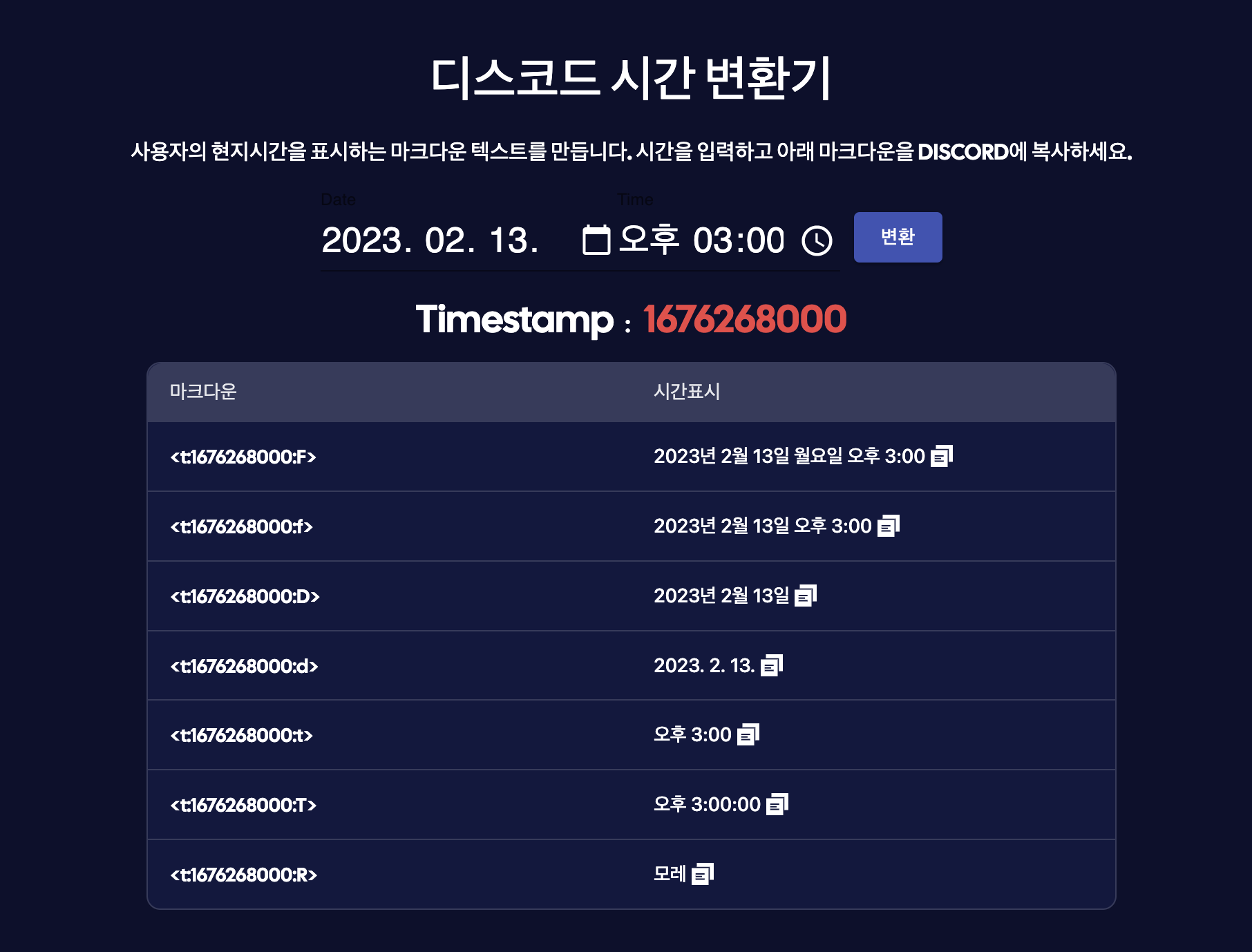 예를 들어, 13일 오후 3시로 시간 공유를 하고 싶은 경우가 있습니다. 이 때, 아래 디스코드 시간 변환기 사이트에서 원하는 시간을 입력하고 면 유닉스 타임이 나오는데요. 아래에 표현하고 싶은 시간을 클릭하면 복사가됩니다. 이것을 디스코드에 입력하면 사용자 시간에 맞게 표현됩니다.