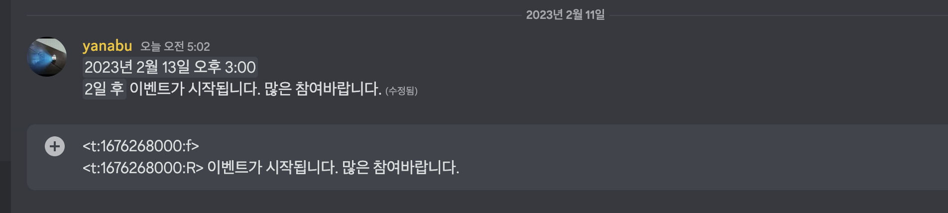 디스코드에서 외국인들하고 시간을 맞춰 채팅해야할때가 종종 있습니다. 나라마다 시간이 다르다 보니 시간 맞추기가 어려울 때가 있습니다. 디스코드에는 시간표시 명령어가 있는데, <t:timestamp:포맷>를 통해서 각자 나라 시간에 맞게 보여줄 수 있습니다.